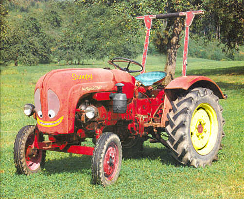 Dieser recht verspielt dreinschauende Acker-Porsche fällt mit seinem lustigen Gesicht zwangsläufig bei jeder Ausfahrt sofort auf. Der Traktor, der von dem Vorbesitzer auf den Namen Snoopy getauft wurde, ist der vorletzte Zugang in unserer kleinen Sammlung; jedoch mittlerweile auch schon seit 9 Jahren bei uns. Die Kinder des Vorbesitzers hatten die Idee mit der “Kriegsbemalung”, wodurch der Traktor das lustige Gesicht erhielt. Der Lauf der Dinge war aber der, dass die Kinder inzwischen erwachsen und aus dem Haus sind, nur der Porsche - Traktor mit seinem Gesicht war immer noch da. Da der Vorbesitzer den Porsche aber schon lange nicht mehr nutzte, entschloss er sich, ihn zum Verkauf in einer Kleinanzeigenzeitung zu annoncieren, wo ich ihn entdeckte. Der Traktor ist, bis auf die “Sonderbeschriftung” nicht restauriert, aber in einem technisch sehr gut erhaltenen Zustand. Insgesamt erweckt er den Eindruck, dass er in seinem Leben nicht viel gelaufen ist. Ausser ein paar kleinen Roststellen vom langen Herumstehen (leider im Sommer teils in der prallen Sonne, wodurch manche Lackstellen ziemlich ausgeblichen matt sind) ist der sonstige Verschleiß nur sehr gering.